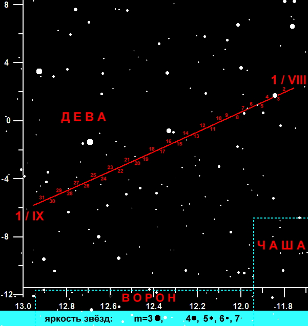 | 2025.08.30 | 12h 53m 33.2s | -05°26'02" | 1.582 | 2.254 | 4.2" | +1.6 | 37.8° | 10:09 | 21:08 |