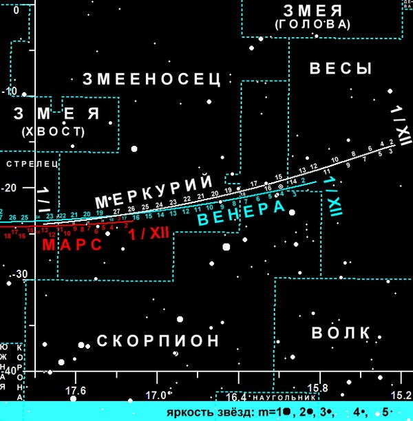 Яркость Меркурия увеличится c m = + 0.2 (01.12.2025) до m = – 0.5 (14.12.2025),