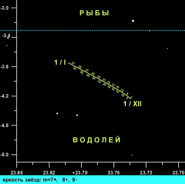 Продолжительность видимости планеты уменьшится в течение месяца с 9.3 ч до 7.4 ч
