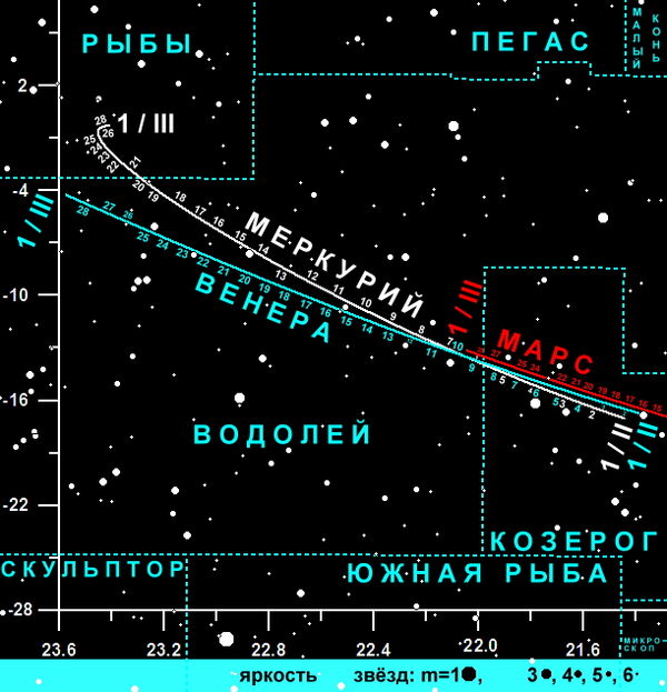В течение месяца продолжительность видимости планеты увеличится с 0.5 ч до 1.2 ч